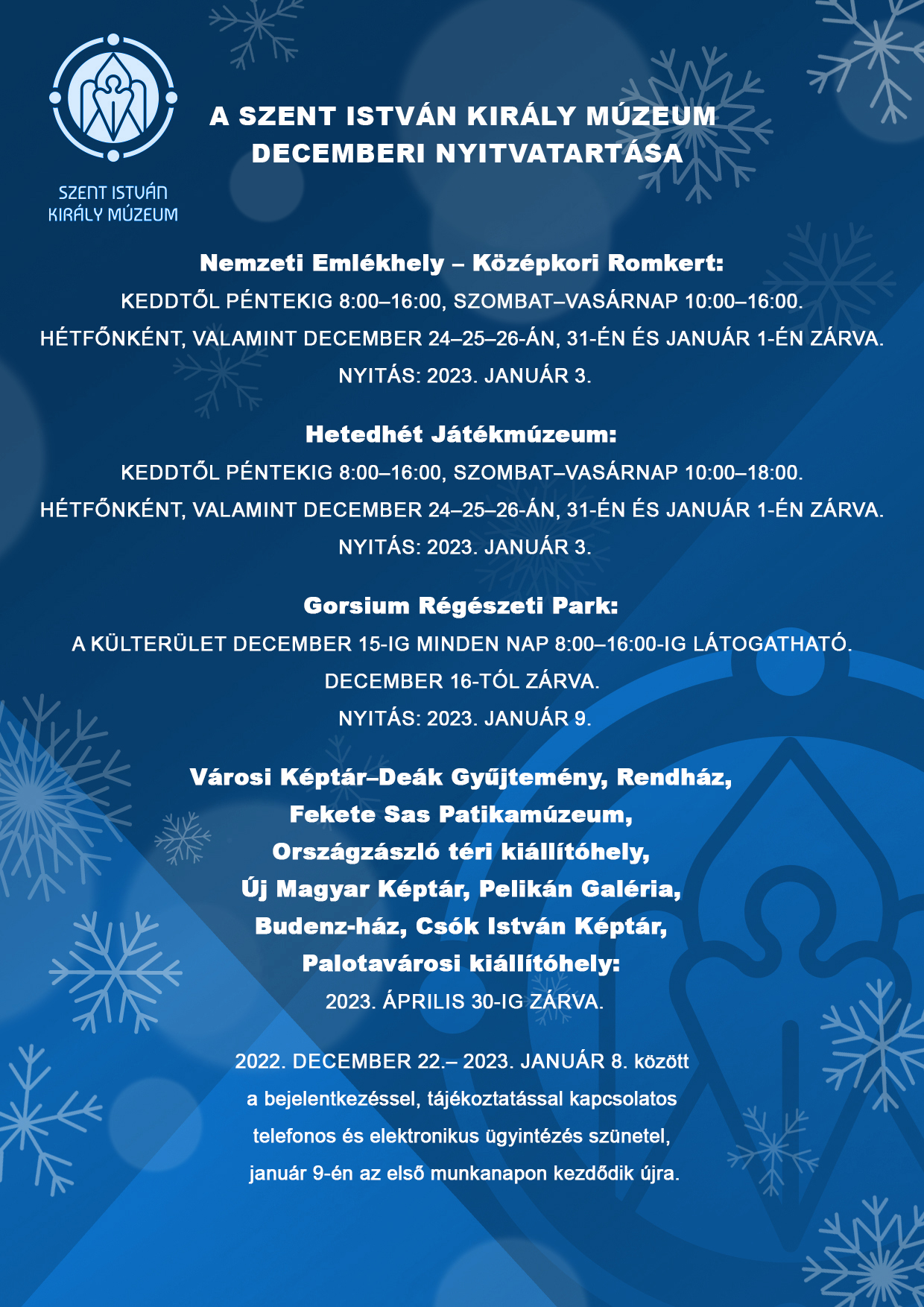 A Szent István Király Múzeum decemberi nyitvatartása