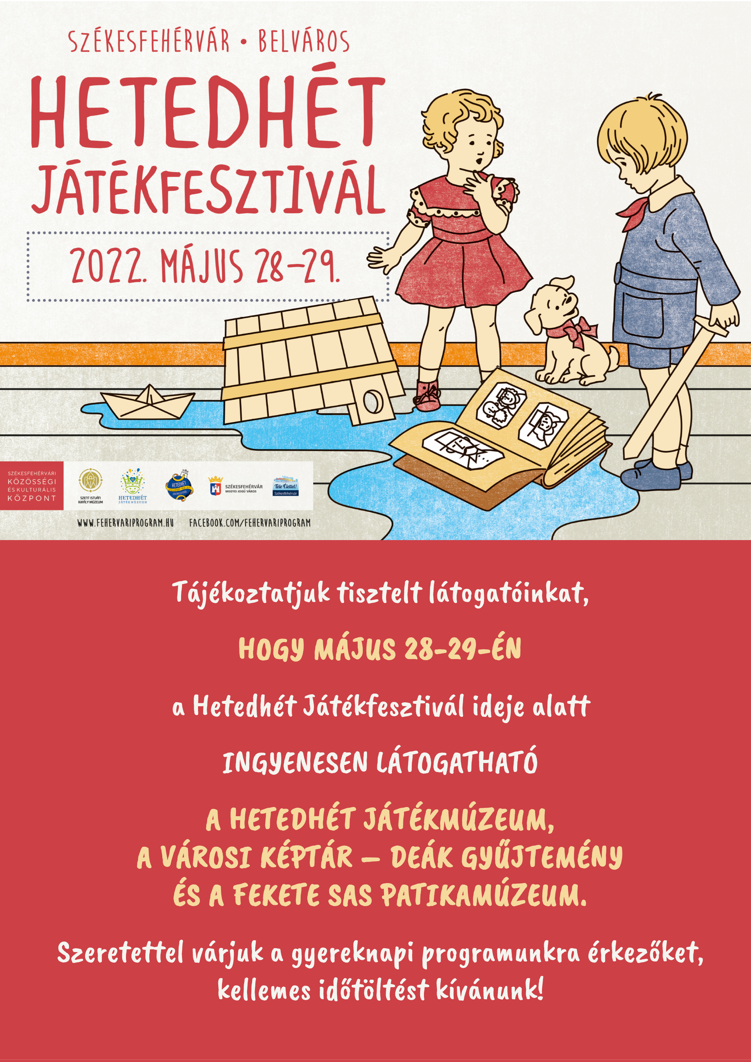 hogy május 28-29-én a Hetedhét Játékfesztivál ideje alatt ingyenesen látogatható a Hetedhét Játékmúzeum, a Városi Képtár – Deák Gyűjtemény és a Fekete Sas Patikamúzeum.