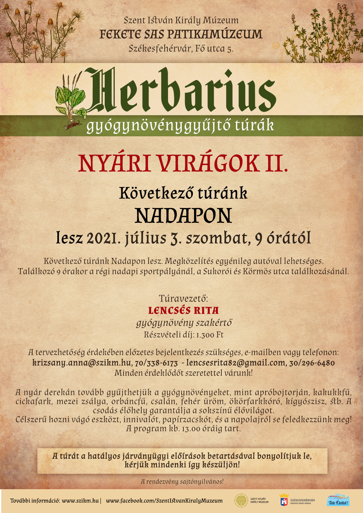 A nyár derekán tovább gyűjthetjük a gyógynövényeket, mint apróbojtorján, kakukkfű, cickafark, mezei zsálya, orbáncfű, csalán, fehér üröm, ökörfarkkóró, kígyószisz, stb. A csodás élőhely garantálja a sokszínű élővilágot. Célszerű hozni vágó eszközt, innivalót, papírzacskót, vagy lenvászon táskát, kosárkát és a napolajról se feledkezzünk meg! A túra kb. 12.00 óráig tart.